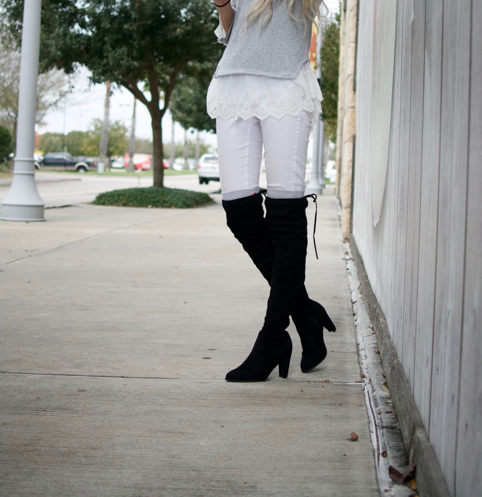 Only 8 days till Christmas ya'll!! As I was shopping for some last minute gifts I wanted to enjoy the warmer weather and get a few pics in one of my favorite new sweaters. I am in love with this lace top from Chicwish! I've linked similar ones that are really cute. The lace adds a feminine touch. I love pairing my OTK boots with white pants, who said you can't wear white all year? Have ya'll finished up your holiday shopping or still doing last minute shopping like me?!
